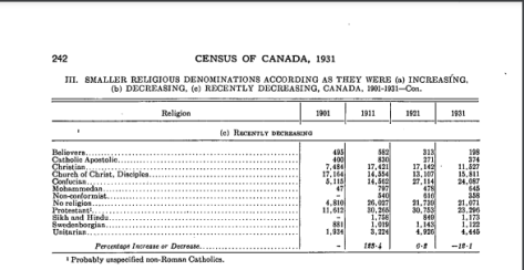 Census information shows that 4,810 Canadians declared “no religion” in 1901. That figure then jumped to more than 26,000 in 1911 and settled at approximately 21,000 by the early 1930s.